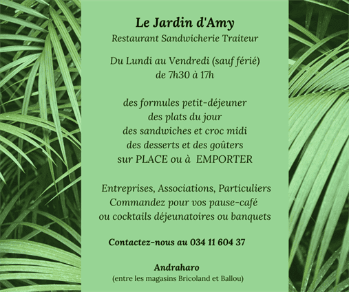le Jardin d’Amy offre un choix de produits répondant aux attentes de tous les moments. Il dispose d’une boutique pour les ventes à emporter ainsi que d’une terrasse pour ceux qui souhaitent s’attabler.