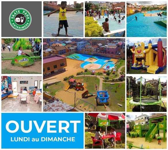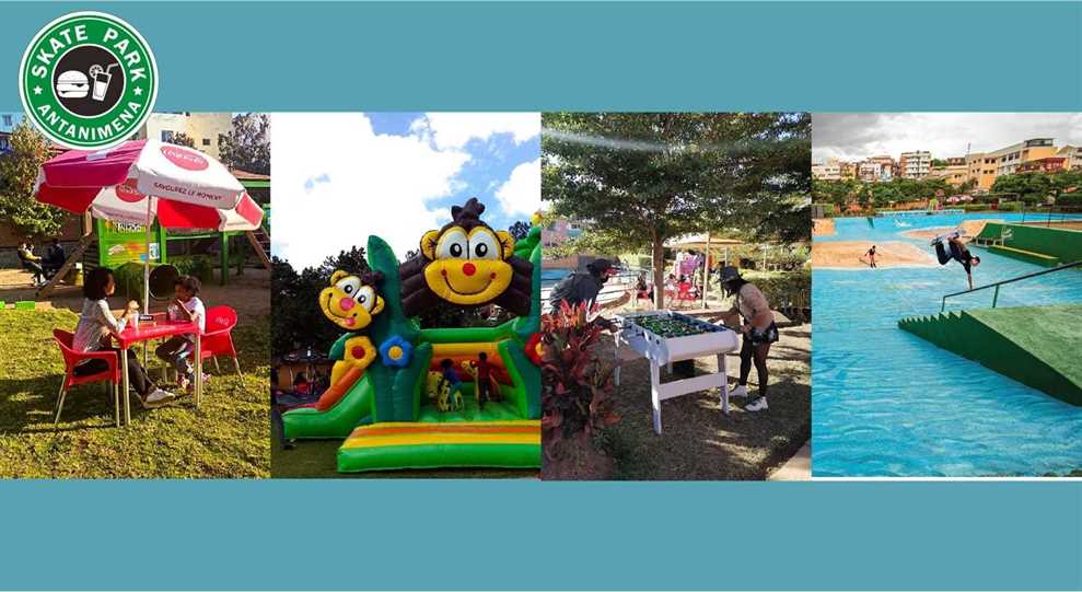 Espaces verts, Gonflables, Trampoline, Skatepark, Pataugeoire, Location de salle, Restaurant, Vente de jeux, à 100m de l’ekar Antanimena 7j/7 – 9h/17h